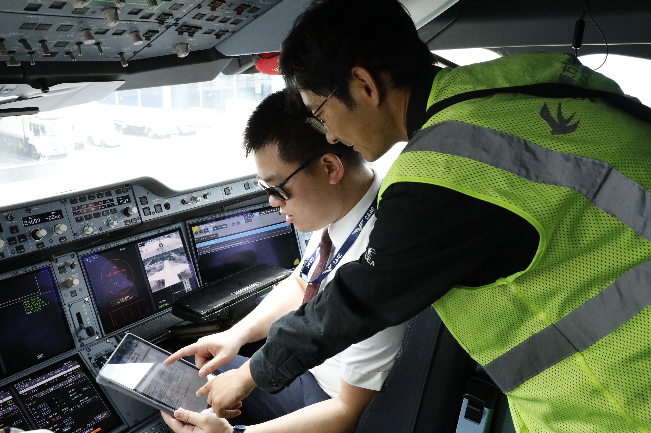 東航A350飛行行組與機(jī)務(wù)工程師對(duì)飛行適航狀態(tài)進(jìn)行確認(rèn)