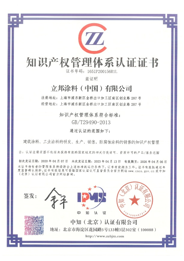 立邦再獲《知識產(chǎn)權(quán)管理體系認(rèn)證證書》