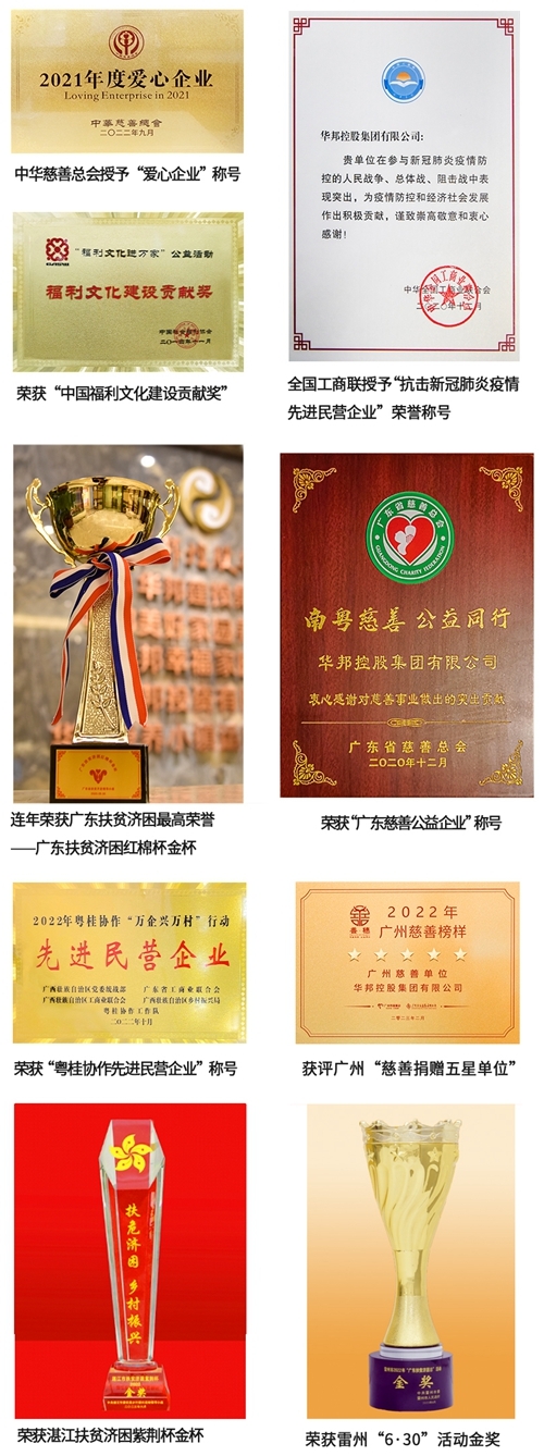 永葆初心,載譽(yù)前行。華邦控股集團(tuán)自成立以來,將社會(huì)責(zé)任提高到自身發(fā)展的戰(zhàn)略高度,積極回報(bào)社會(huì),持續(xù)增進(jìn)民生福祉,愛心善舉獲得社會(huì)各界的肯定和贊譽(yù),慈善影響力與日俱增:榮獲中華慈善總會(huì)愛心企業(yè)、全國抗擊新冠肺炎疫情先進(jìn)民營企業(yè)、中國福利文化建設(shè)貢獻(xiàn)獎(jiǎng)、粵桂協(xié)作先進(jìn)民營企業(yè)、廣東扶貧濟(jì)困紅棉杯金杯、廣東百佳愛心幫扶企業(yè)、湛江市紫荊杯金杯、雷州市扶貧濟(jì)困日活動(dòng)金獎(jiǎng)等榮譽(yù),獲評(píng)廣州最具影響力慈善企業(yè)、廣州慈善企業(yè)榜樣、慈善捐贈(zèng)五星單位。