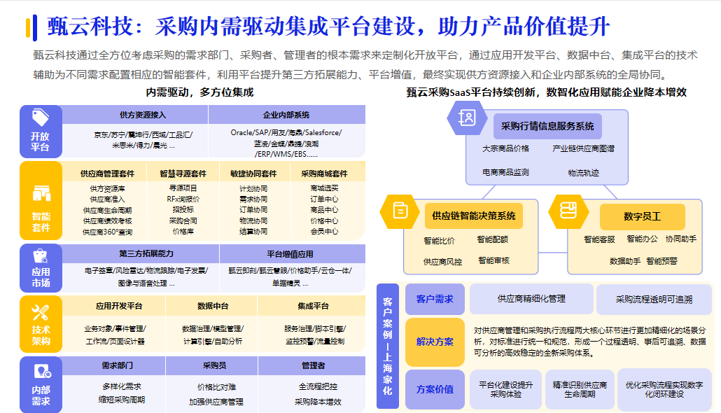 再例如,甄云科技通過全方位考慮采購的需求部門、采購者、管理者的根本需求來定制化開放平臺,實現供方資源接入和企業(yè)內部系統的全局協同。