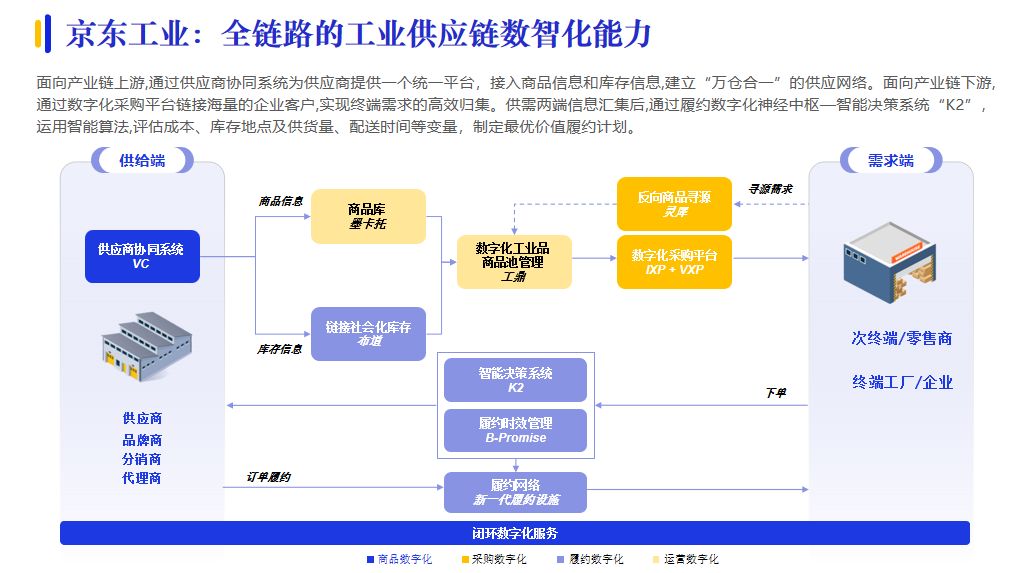數字供應鏈發(fā)展已經從關注部分環(huán)節(jié)、部分參與者,轉向關注全鏈條、生態(tài),因此,全鏈路數智供應鏈解決方案漸成主流。例如,京東工業(yè)面向產業(yè)鏈上下游,通過供應商協同系統建立“萬倉合一”的供應網絡;通過數字化采購平臺實現終端需求的高效歸集,再通過智能決策系統“K2”,制定最優(yōu)價值履約計劃。
