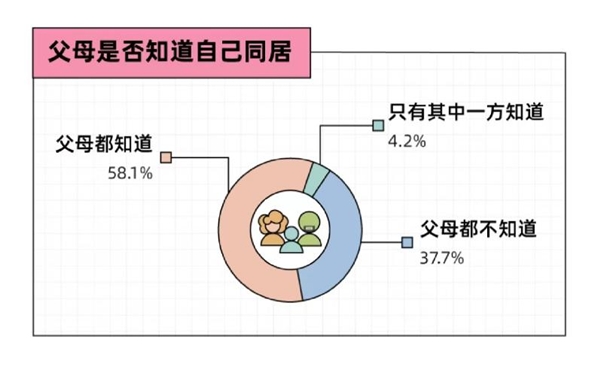 尤其值得注意的是,根據(jù)《報告》,37.7%的年輕人壓根就沒讓父母知道自己已經(jīng)同居,還有4.2%的受訪者表示只讓父母中的一方知道情況。畢竟,父母對待同居的態(tài)度相對保守,尤其是女方,《報告》顯示僅有約三分之一的父母支持女生同居。