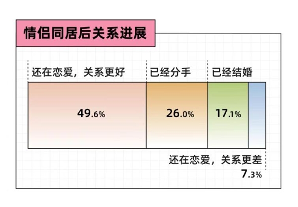 “同居分離會產(chǎn)生焦慮癥嗎”“試婚同居生子男方棄養(yǎng)”“同居該不該AA”……微博熱搜榜上,同居始終是一大熱門爭議話題。當(dāng)熱戀期的完美形象分崩離析,留給同居的年輕人的,是否只是一地雞毛?實(shí)際上,《報告》顯示,多數(shù)同居關(guān)系有著美好結(jié)局。