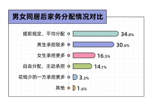 令人意外的是,《報告》顯示,“男生承擔(dān)更多家務(wù)”的比例為30.6%,高于女生(16.5%),完全顛覆了刻板認(rèn)知。此前的一項(xiàng)調(diào)查也顯示,同居后,男生們的“居家能力”大幅提升,提升幅度甚至超過女生,不過在結(jié)婚后又會有所下降。