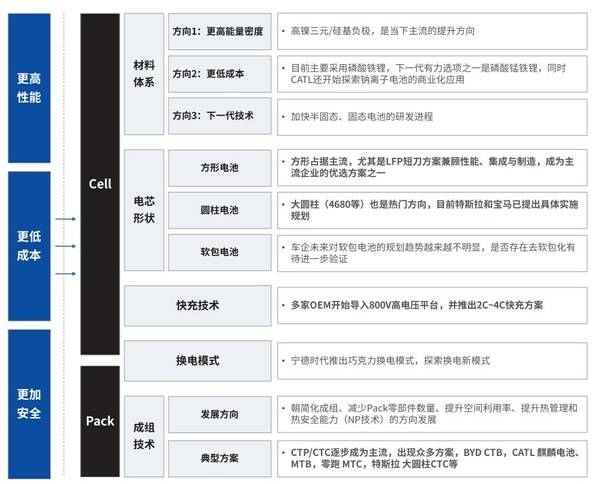 材料從根本上決定著電池性能。通過(guò)改進(jìn)材料提高電池性能、優(yōu)化電池老化機(jī)制、應(yīng)用新型材料、改變電芯結(jié)構(gòu)是電芯研發(fā)的主要方向。 例如,材料體系方面,采用新型材料體系(高鎳正極、硅基負(fù)極、鋰金屬負(fù)極、固態(tài)電解質(zhì)等),提高單體能量密度;或者研制出磷酸錳鐵鋰,探索鈉離子電池的商業(yè)化應(yīng)用,降低成本;或者加快固態(tài)電池的研發(fā)進(jìn)程,使電池性能更高,更耐久。電芯形狀方面,方形電池,尤其是LFP短刀兼顧性能、集成與制造,成為主流企業(yè)的優(yōu)選方案之一;大圓柱電池也是熱門方向,特斯拉和寶馬均已提出具體的實(shí)施規(guī)劃??斐浼夹g(shù)方面,多家主機(jī)廠開始導(dǎo)入800V高電壓平臺(tái),并聯(lián)合電池企業(yè)推出2C~4C快充方案。