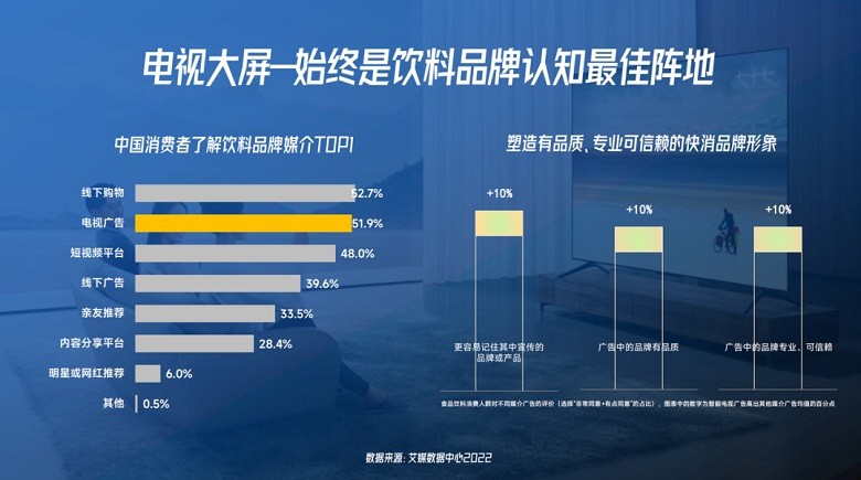 根據(jù)艾媒數(shù)據(jù)中心2022的統(tǒng)計分析,電視廣告是中國消費者了解飲料品牌的第一媒介,是建設(shè)飲料品牌認知的最佳陣地,有助于塑造高品質(zhì)、可信賴的品牌形象。