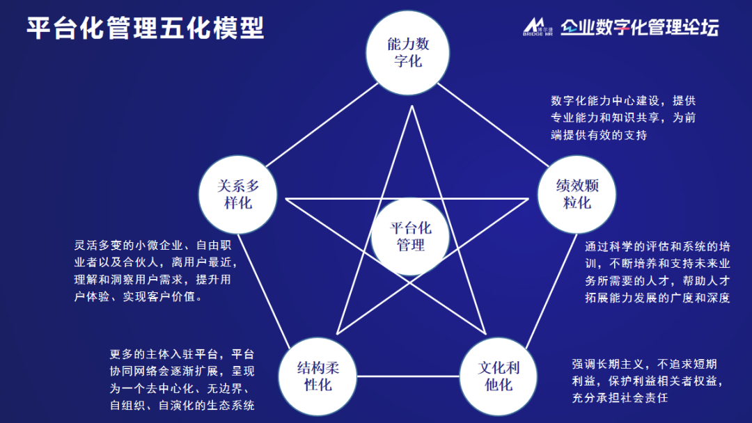 從2013年的OA,2015年ERP,到2018年開始嘗試開發(fā)人力資源系統(tǒng)直到2021年推廣使用,再到2022年數(shù)字挖掘、智能分析,以及未來的智慧平臺,智慧決策、智能投放和智能預警。博爾捷集團的平臺化轉(zhuǎn)型實踐,以著高效的數(shù)字化的平臺和智慧化的生態(tài)平臺為依托,遵循著平臺化管理五化模型不斷進行著。平臺化管理五化模型,更是其中的重點。