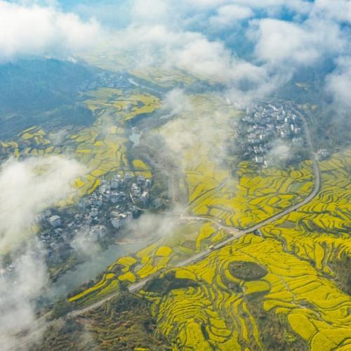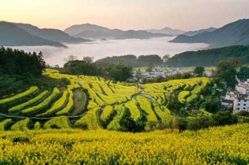 進(jìn)入三月中旬以來(lái),江西婺源的十萬(wàn)多畝油菜花競(jìng)相開放,正式進(jìn)入了盛花期。迷人花海遍布每個(gè)村莊,風(fēng)姿灼灼,景色迷人。在“中國(guó)四大花?!敝坏慕瓗X景區(qū),漫山遍野的油菜花隨著梯田彎曲的線條蜿蜒至遠(yuǎn)方,猶如金蛇舞動(dòng),蔚為壯觀。在李坑、思溪延村等景區(qū)油菜花盛開于徽派建筑之間,與小橋、流水、人家構(gòu)成了一幅娟秀柔美的江南春景圖,引來(lái)了天南地北的游客賞花潮。