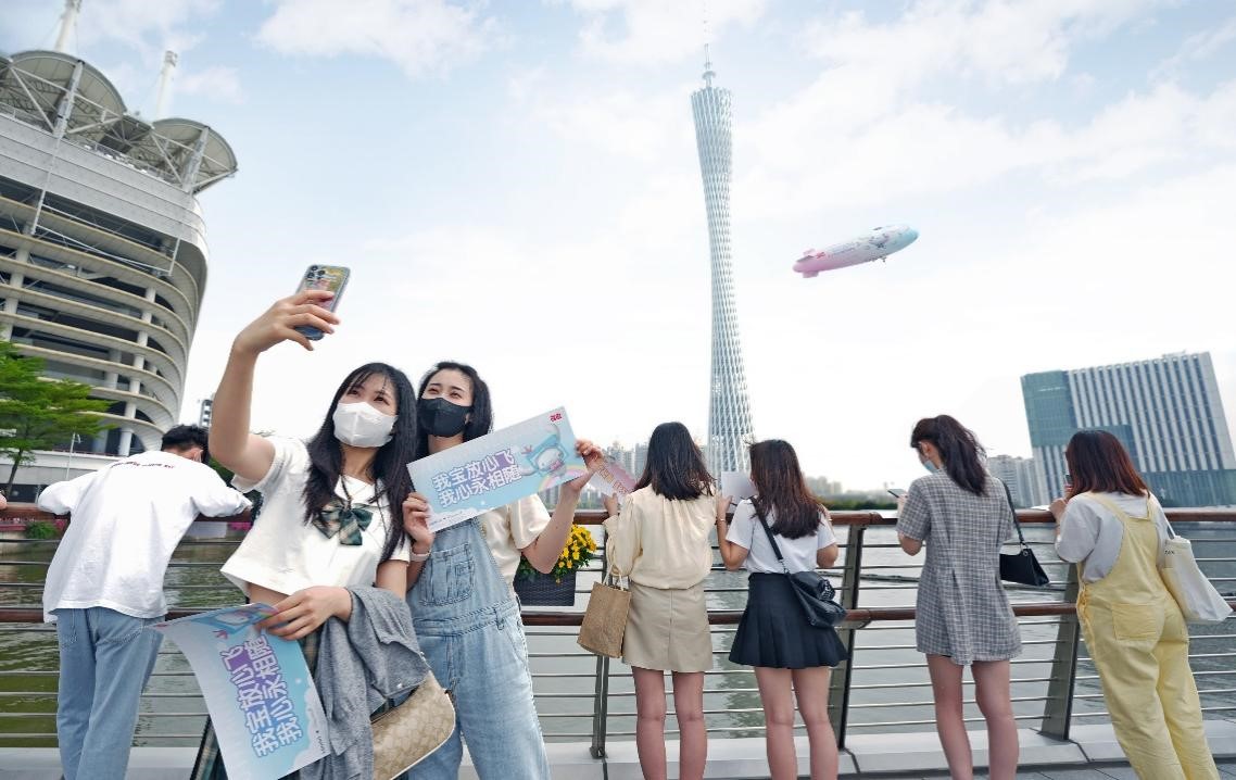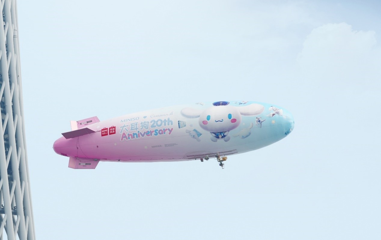 在“大耳狗20周年”期間,名創(chuàng)優(yōu)品于3月19日當(dāng)天獨(dú)家打造了一架豪華飛艇,把“大耳狗寵上天”。這架飛艇圍繞廣州塔、海心橋、獵德大橋環(huán)繞飛行,從下往上看飛艇的外觀,正是大耳狗20周年慶主題海報(bào)。隨著飛艇乘風(fēng)而上,大耳狗仿佛躲進(jìn)輕紗包裹般的云端里,沖著地面的人打趣逗樂。