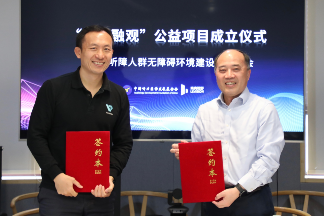中國(guó)聽(tīng)力醫(yī)學(xué)發(fā)展基金會(huì)常務(wù)副理事長(zhǎng)兼秘書(shū)長(zhǎng)公澤忠(右)同北京亮亮視野科技有限公司首席運(yùn)營(yíng)官婁身強(qiáng)(左)共同完成公益項(xiàng)目的捐贈(zèng)儀式