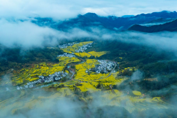 清風(fēng)吹拂金波涌,飄溢醉人濃郁香,在“中國(guó)四大花?!敝坏慕瓗X梯田,漫山遍野的油菜花隨著梯田彎曲的線條蜿蜒至遠(yuǎn)方,猶如金蛇舞動(dòng)。煙雨中的江嶺,空氣中飄散著清新的泥土氣息和油菜花的清香,置身江嶺梯田,遠(yuǎn)遠(yuǎn)望著民居與花海仿若仙,朦朧夢(mèng)幻?!@正是在婺源江嶺這幅水墨江南畫里,讓我們無(wú)比渴求的,仿佛從畫中來(lái),帶著水墨香。