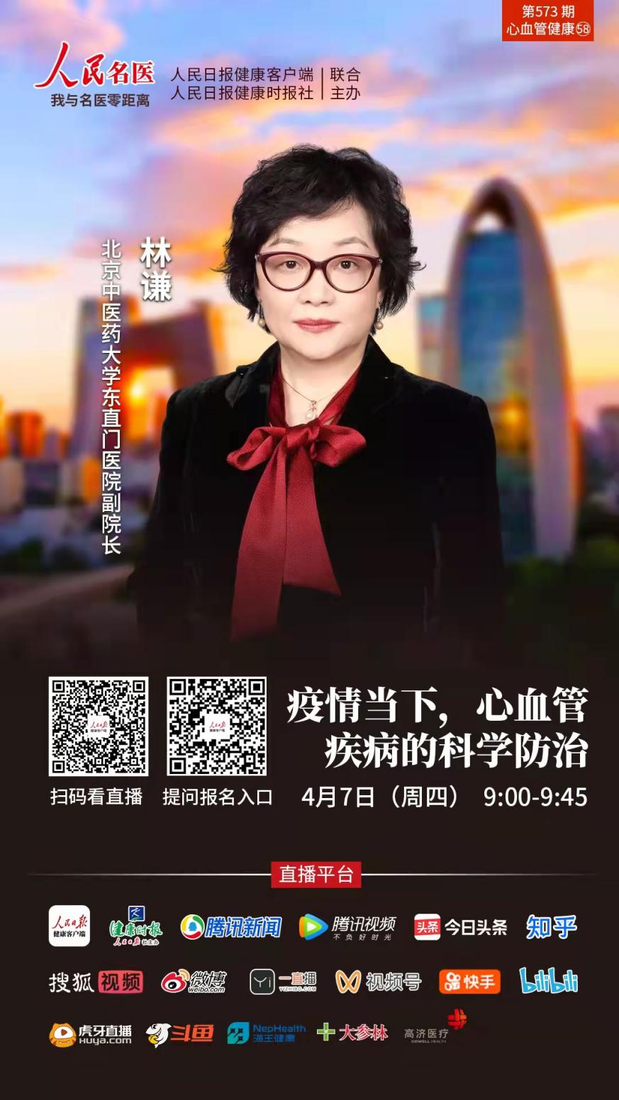 4月7日上午9:00~9:45,以嶺藥業(yè)聯(lián)合人民日?qǐng)?bào)健康客戶端策劃的世界健康日直播訪談節(jié)目《疫情當(dāng)下,心腦血管疾病的科學(xué)防治》,特別邀請(qǐng)到北京中醫(yī)藥大學(xué)東直門醫(yī)院副院長(zhǎng)林謙為大家進(jìn)行權(quán)威解答!