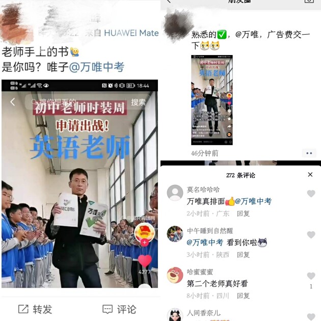 “王老師穿西服好帥啊”“吳老師真像標準的模特”“期待下一場老師T臺秀”……記者發(fā)現(xiàn),該視頻得到了大量點贊轉發(fā),幾乎每一位老師都收獲了大量評論和“粉絲”,尤其一位舉著英語資料的男教師,令許多網(wǎng)友驚呼仿佛又要考試了。原來,除了男老師“冷酷”的表情使大家聯(lián)想到自己曾經(jīng)嚴肅的老師外,還因為他手里舉著一本《萬唯中考試題研究》。據(jù)了解,《萬唯中考試題研究》在全國30個省(區(qū)市)的初中校園中廣泛使用,因此當它出現(xiàn)時,不少網(wǎng)友直呼“熟悉”“青春回來了”。