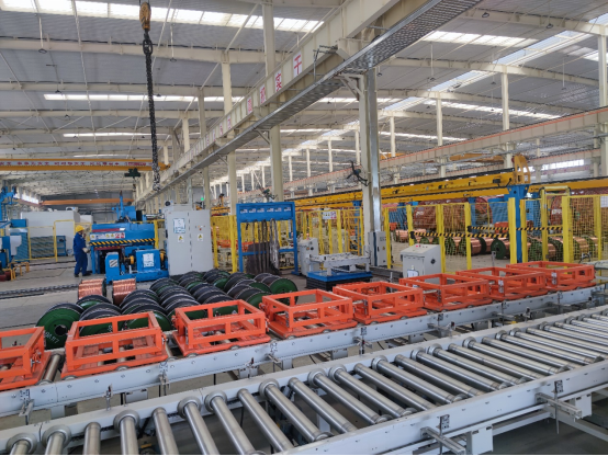 藍(lán)色自行小車把巨大的電纜軸送到既定位置,黃色的機(jī)械臂將線軸卡好,設(shè)備啟動后線纜開始自動纏繞,一盤整齊的電纜線慢慢成型。車間里,紅、黃、藍(lán)、白色的機(jī)械臂、自行小車等機(jī)械設(shè)備分工合作,有條不紊地生產(chǎn)。諾大的廠房中,零星行走著幾位身著藍(lán)色工裝、頭戴安全帽的工作人員。