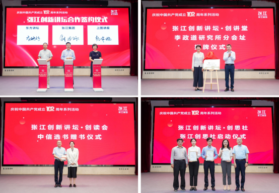 張江創(chuàng)新講壇合作簽約儀式(左上)、李政道研究所分會(huì)址揭牌(右上)、中信選書(shū)贈(zèng)書(shū)儀式(左下)、張江創(chuàng)思社啟動(dòng)儀式(右下)