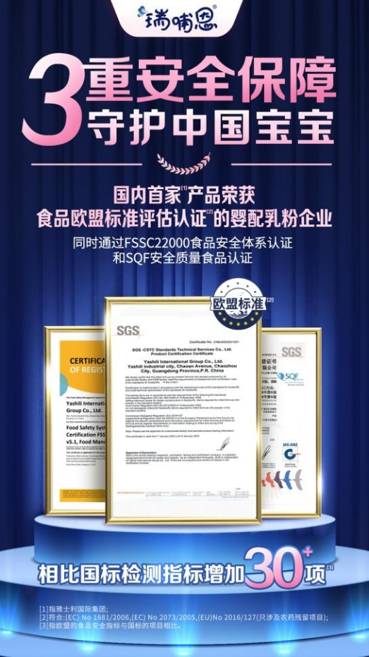 作為乳業(yè)領(lǐng)軍企業(yè),雅士利國(guó)際的質(zhì)量文化建設(shè)一直走在行業(yè)前沿,也由此獲得業(yè)內(nèi)多項(xiàng)認(rèn)可,榮獲國(guó)際權(quán)威認(rèn)證機(jī)構(gòu)SGS授予的嬰幼兒配方食品歐盟標(biāo)準(zhǔn)評(píng)估認(rèn)證的產(chǎn)品認(rèn)證證書,成為國(guó)內(nèi)首家產(chǎn)品榮獲食品歐盟標(biāo)準(zhǔn)評(píng)估認(rèn)證的嬰配粉乳粉企業(yè),同時(shí)還獲得FSSC22000食品安全體系認(rèn)證和SQF食品安全質(zhì)量認(rèn)證。