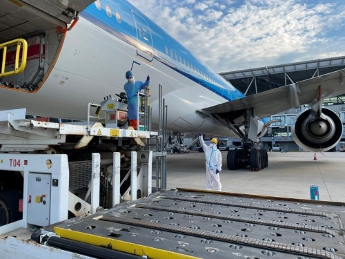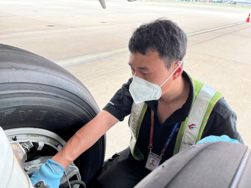 擦拭飛機(jī)起落架鏡面是航線保障中很尋常的一項(xiàng)工作,但由于今天外部氣溫較高,吸油棉接觸飛機(jī)鏡面后,東航機(jī)務(wù)員工的手心瞬間感覺(jué)炙熱
