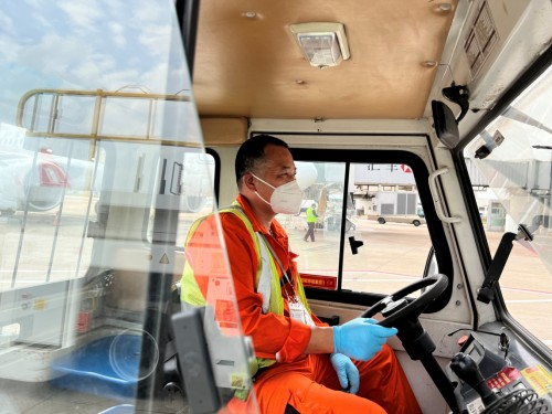MU6328航班到達(dá)行李運(yùn)送中,開(kāi)窗通風(fēng)才能讓小小的行李牽引車(chē)車(chē)內(nèi)溫度降低點(diǎn)。