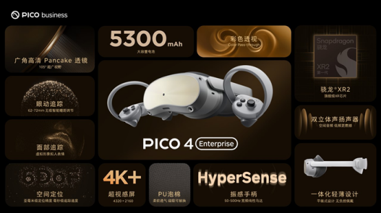 本次新品VR一體機(jī)PICO 4 Enterprise憑借強(qiáng)勁的性能,為用戶帶來更好的視覺體驗(yàn)和更強(qiáng)的沉浸感。它采用的Pancake光學(xué)方案能夠?qū)崿F(xiàn)105°超廣視野,精彩畫面盡收眼底。同時(shí),其分辨率高達(dá)4320 x 2160的4K+超視感屏,最高可實(shí)現(xiàn) 90Hz 刷新率,更有1200 PPI的超清晰畫面表現(xiàn),使呈現(xiàn)在眼前的場景絲毫畢現(xiàn)、栩栩如生,仿佛置身其中。此外,PICO 4 Enterprise還搭載驍龍?XR2芯片,配備256G存儲(chǔ)和8GB DDR5內(nèi)存,使操作更快、更流暢,內(nèi)置的5300mAh大容量電池滿足更長續(xù)航。