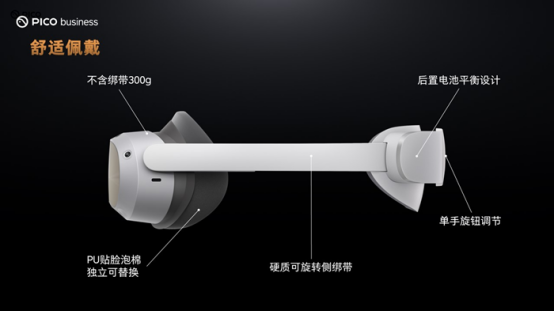 PICO 4 Enterprise采用一體化輕薄機(jī)身設(shè)計(jì),符合人體工學(xué),久戴也舒適。機(jī)身不含綁帶僅重300g,只比一臺(tái)常規(guī)的智能手機(jī)重一點(diǎn),采用后置電池平衡設(shè)計(jì)和硬質(zhì)可旋轉(zhuǎn)側(cè)綁帶,支持單手旋鈕調(diào)節(jié),大大優(yōu)化了用戶長時(shí)間佩戴的體驗(yàn)。值得一提的是,PICO 4 Enterprise專為企業(yè)級(jí)用戶設(shè)計(jì)了獨(dú)立可替換的PU貼臉泡棉,相比布料的消費(fèi)者版,更適合多人使用,滿足長時(shí)間佩戴的需求。