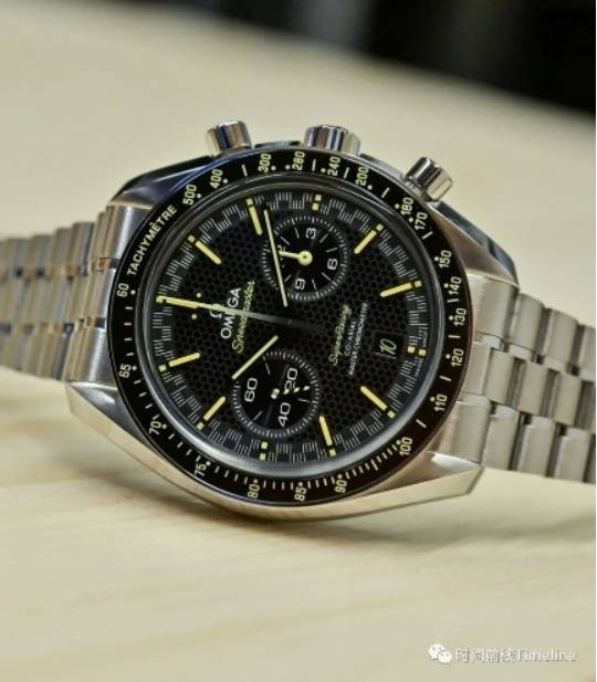 超霸Super Racing的盤面布局,是雙眼計時盤,3點位是60分鐘和12小時計時盤 (兩根計時指針是同軸的),9點位是小秒針。但凡是歐米茄9系計時機芯,都是這種布局。手表盤面上呈現(xiàn)“蜂巢”結構。