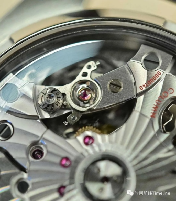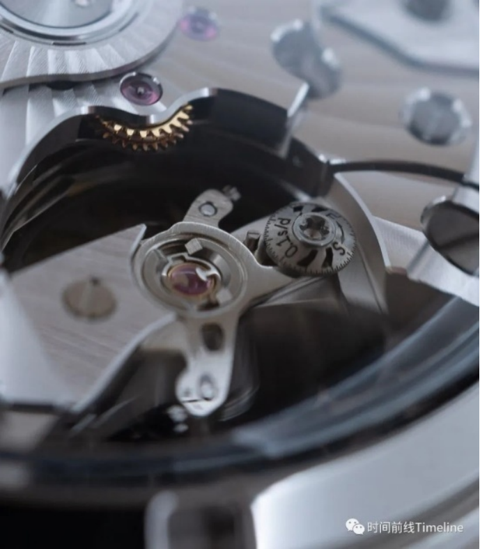 使用柱狀輪,垂直離合,硅游絲,無卡度砝碼微調,擺頻28800次/時,動力60小時。但各位可以看到,擺輪夾板上,多了Spirate系統(tǒng)的調節(jié)“小圓片”。