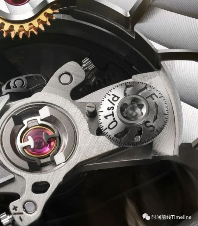 擺輪夾板上的小圓片,下面有一個凸輪。凸輪可以帶動硅游絲“刀片”造型的末端,從而壓縮或放松硅游絲,以此改變硅游絲的“彈跳能力”、“彈跳半徑”(即,剛性),實現(xiàn)對手表走時的高精度調節(jié)。