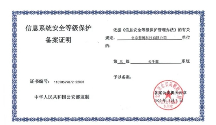 而作為全域消費者數(shù)字化運營服務商,我們有責任確??蛻粲脩舻碾[私得到充分的尊重和保護?;鄄┛萍荚魄лd是行業(yè)中同時獲得ISO27001(信息安全管理體系認證證書)與「三級等保」雙重認證的企業(yè)產(chǎn)品,充分體現(xiàn)出慧博科技云千載數(shù)據(jù)中臺系統(tǒng)在用戶信息安全管理方面擁有領先的信息技術水平和安全防護能力。
