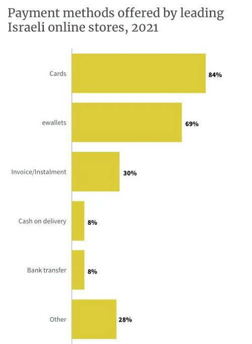 以色列主要的支付方式包括Visa、MasterCard,Isracard(以色列本土支付方式),Paypal、Other Wallets和American Express??ㄖЦ对谝陨蟹浅A餍?#xff0c;TOP100的零售商中,84%提供信用卡支付,69%提供電子錢(qián)包支付,Visa和萬(wàn)事達(dá)信用卡是當(dāng)?shù)刈钍軞g迎的付款方式。