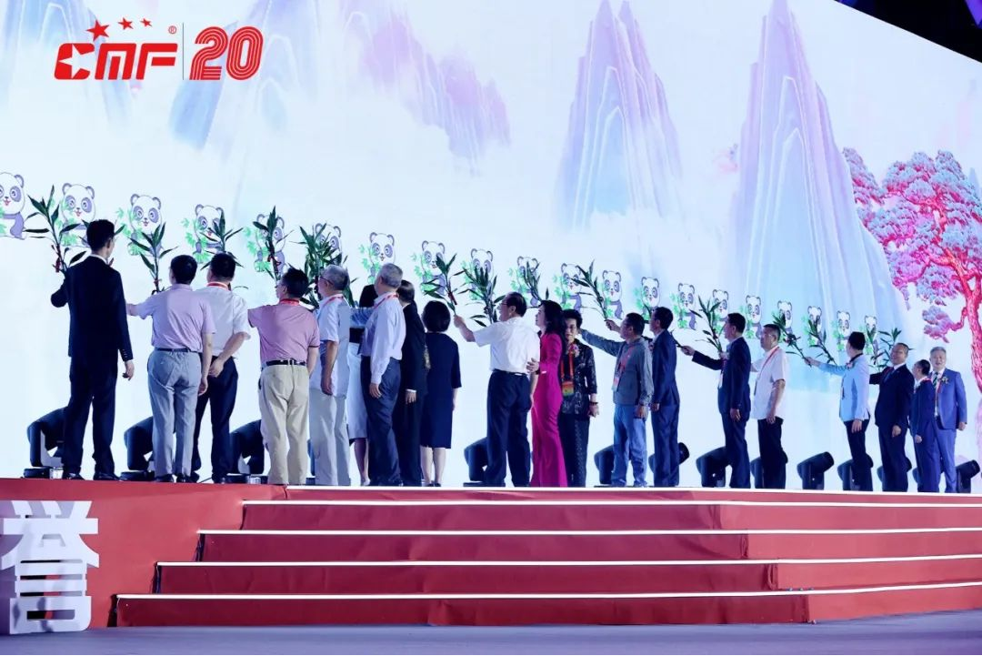 20位貴賓每人手拿一個象征四季常青,頑強(qiáng)生命、節(jié)節(jié)高升的竹子,“喂”向屏幕上的國寶“小小”大熊貓,當(dāng)國寶得到了“食物”的給養(yǎng),茁壯成長,20個“小小”大熊貓匯聚成一個巨大的有知識、有力量、有擔(dān)當(dāng)?shù)拇笮茇垺?/p>