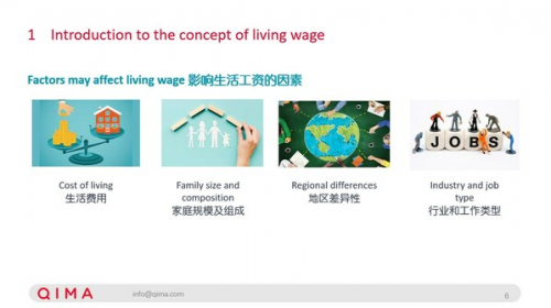 如何確定生活工資?啟邁QIMA專家介紹,生活費(fèi)用、家庭規(guī)模及組成、地區(qū)差異性、行業(yè)和工作類型都是影響生活工資的因素。通常是先確定特定地區(qū)基本但體面生活的成本,包括食物、住房、教育、醫(yī)療保健、交通、服裝、意外開(kāi)支及其他家庭基本需求。然后將家庭的總成本除以家庭中在職成年人平均數(shù),并考慮其他收入者的貢獻(xiàn),并根據(jù)當(dāng)?shù)貎r(jià)格和類型進(jìn)行量身定制。這個(gè)數(shù)值代表該地區(qū)一個(gè)工薪階層單月的必要實(shí)得工資或凈生活工資。最后,凈生活工資根據(jù)稅收和扣除額進(jìn)行調(diào)整。